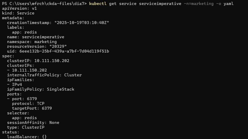 - No hay un comando directo o sencillo para de forma imperativa relacionar el selector del service. Este es el service construido con el Spec: Selector: app: redis