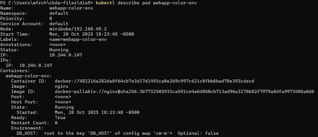 ya que el ejercicio anterior me solicito crearlo una ENV con mi pod, aprovechare a crear una ENV con el configmap. Por lo visto es asi en el modo declarativo.
